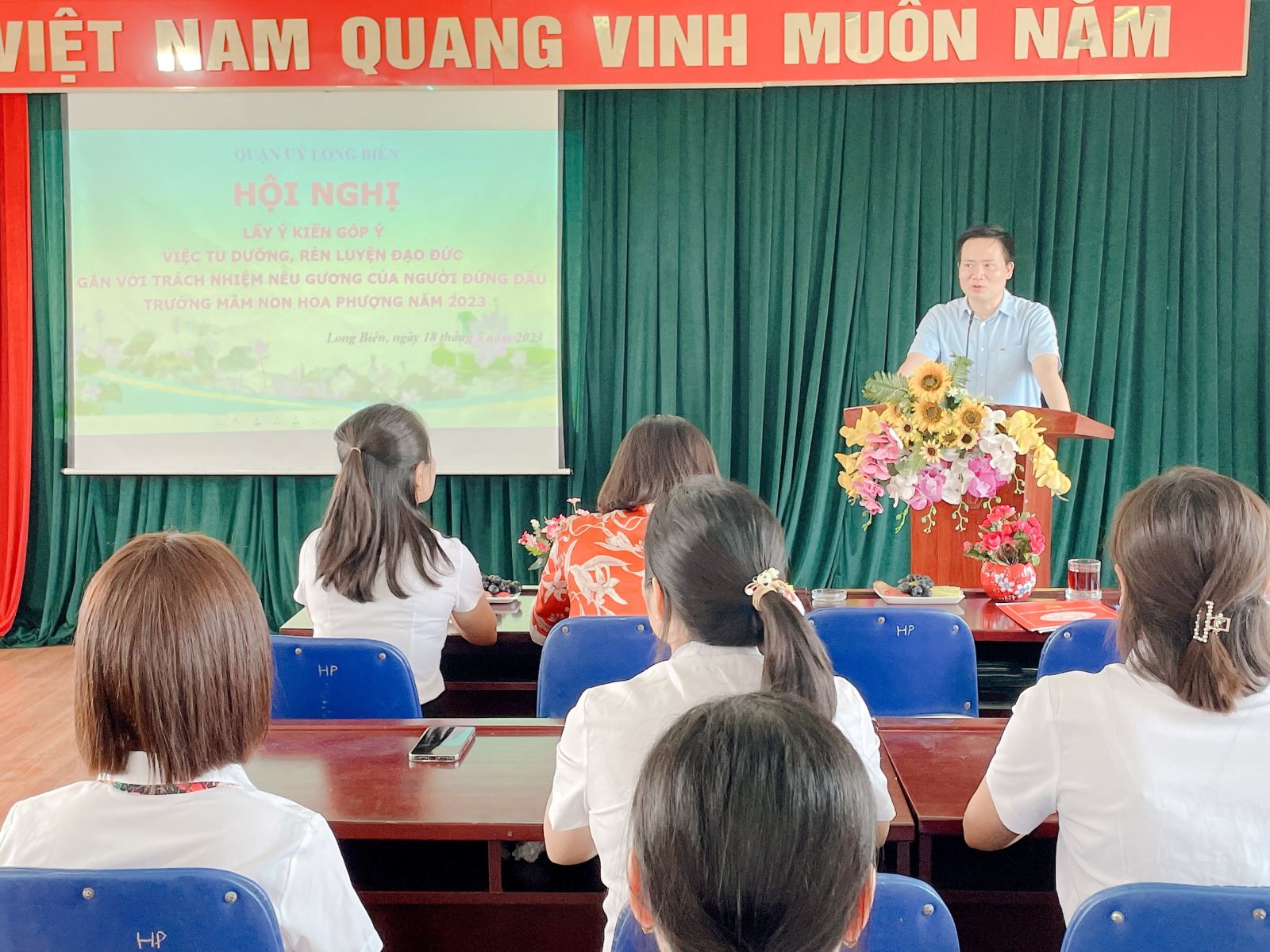 Lấy ý kiến góp ý việc tu dưỡng, rèn luyện đạo đức gắn với trách nhiệm nêu gương của người đứng đầu các địa phương và một số trường học công lập trên địa bàn quận Long Biên năm 2023”, đươc sự chỉ đạo của Ban thường vụ Quận ủy Long Biên, sáng ngày 18/5/2023 trường MN Hoa Phượng long trọng tổ chức Hội nghị Lấy ý kiến góp ý việc tu dưỡng, rèn luyện đạo đức gắn với trách nhiệm nêu gương của người đứng đầu.