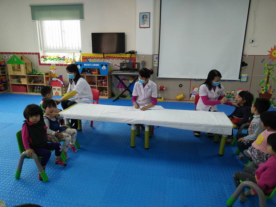 Trong các hoạt động của nhà trường, công tác chăm sóc sức khoẻ ban đầu cho trẻ là một việc làm luôn được nhà trường đặc biệt quan tâm. Năm nay, việc tổ chức khám sức khoẻ định kỳ cho trẻ đã được nhà trường thực hiện theo kế hoạch. Tất cả các trẻ của 9 lớp trong trường đều được khám với các nội dung: Cân nặng, chiều cao, khám tai, mắt, mũi, họng, kiểm tra tim và các bệnh về đường hô hấp.....