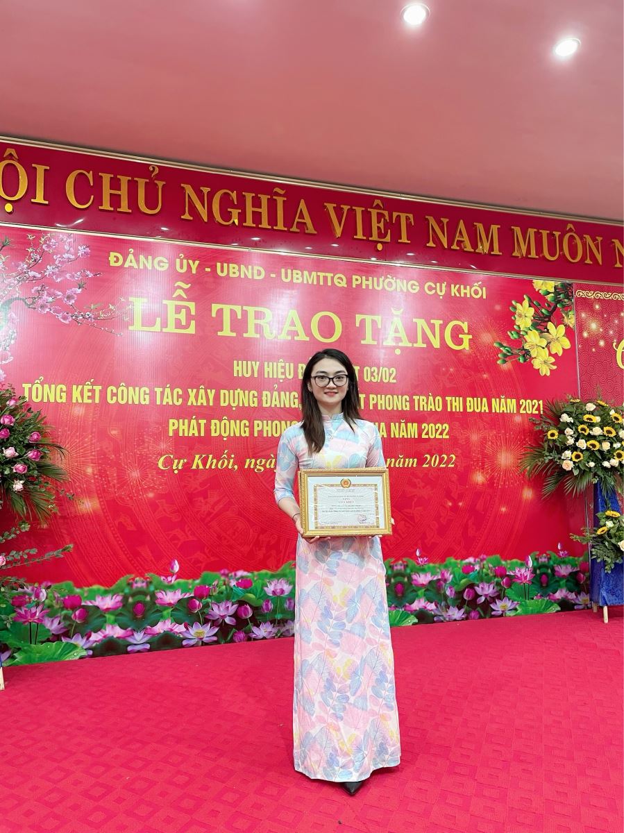 Trong buổi lễ trao tặng “Huy hiệu Đảng đợt 03/02 – Tổng kết công tác xây dựng Đảng, tổng kết phong trào thi đua năm 2021 – Phát động phong trào thi đua năm 2022” của Phường Cự Khối quận Long Biên vào ngày 26/01/2022, đồng chí Dương Thị Thu Trang được vinh dự là một trong những đảng viên trẻ xuất sắc được vinh danh. Đây là niềm tự hào to lớn đối với đồng chí nói riêng và Chi bộ trường mầm non Hoa Phượng nói chung.