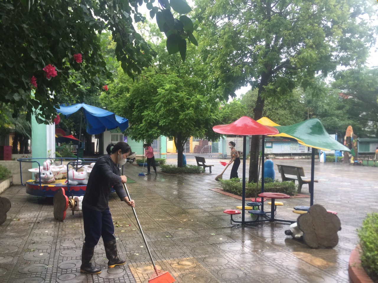 Đúng 8h00 phút sáng, CBGVNV nhà trường có mặt thực hiện nghiêm túc theo lịch phân công của BGH chia thành các nhóm cắt tỉa cây, nhổ cỏ, đánh cọ rêu xung quanh sân trường, các khu vui chơi, Rà soát toàn bộ các chậu, bồn chức nước tránh nước ứ đọng và rắc vôi bột toàn bộ sân trường, các hố ga, các thành tường.