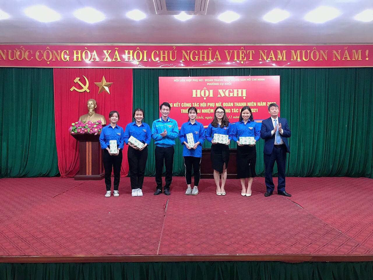 Đ/c Dương Thị Thu Trang (đứng thứ 2 từ phải qua) nhận phần thưởng của BCH Đoàn TN phường Cự Khối