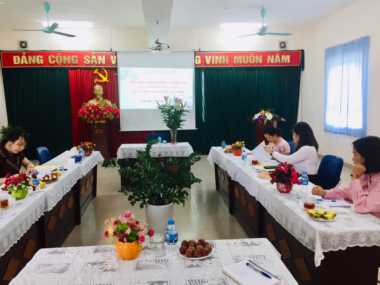 Đoàn đã đi thăm quan khung cảnh và tất cả các khu vực của nhà trường sau đó lên góp ý ở phòng Hội đồng của nhà trường.