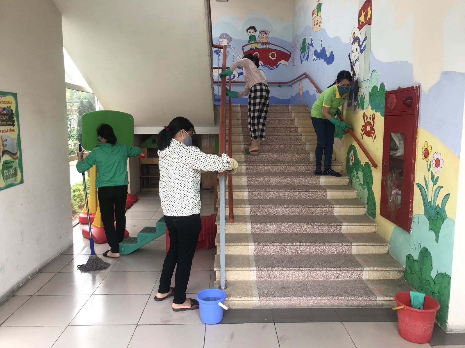 Bắt đầu từ 8h00 sáng, toàn thể CBGVNV đã đến đông đủ, sau khi nghe BGH phân công, các tổ khối bắt tay vào công việc của mình tập trung vệ sinh các khu vực chung của nhà trường như: các phòng chức năng, khu vệ sinh, khu hiệu bộ, lau các hành lang, cầu thang, lan can... sau đó đến khoảng 10h30, các lớp về lớp vệ sinh.
